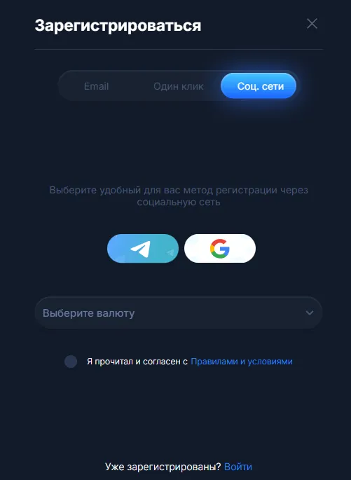 Отдельно стоит упомянуть возможность авторизации через социальные сети. Если к учетной записи привязан Google или Telegram, войти получится с помощью соответствующих иконок.