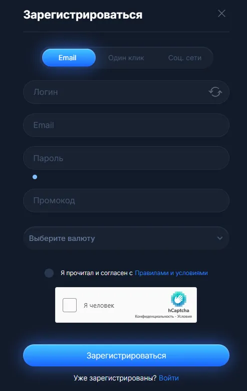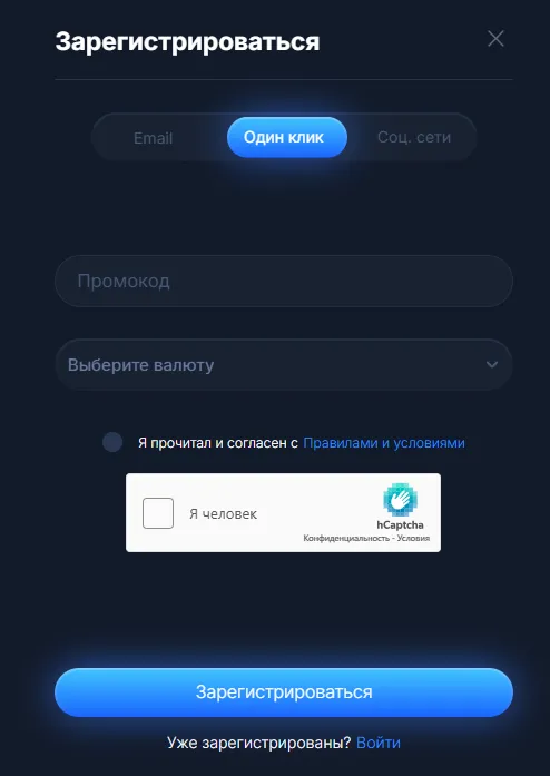 Желающим получить бонус за регистрацию Vodka Casino предлагает создание личного счета от 18 лет. Ознакомившись с правилами, необходимо кликнуть по соответствующей клавише в хедере интерфейса. Доступно несколько способов регистрации: по электронной почте, в один клик или через соцсети. Обязательно внимательно заполнить анкету, выбрать валюту для счета и прикрепить бонусный промокод, если имеется.